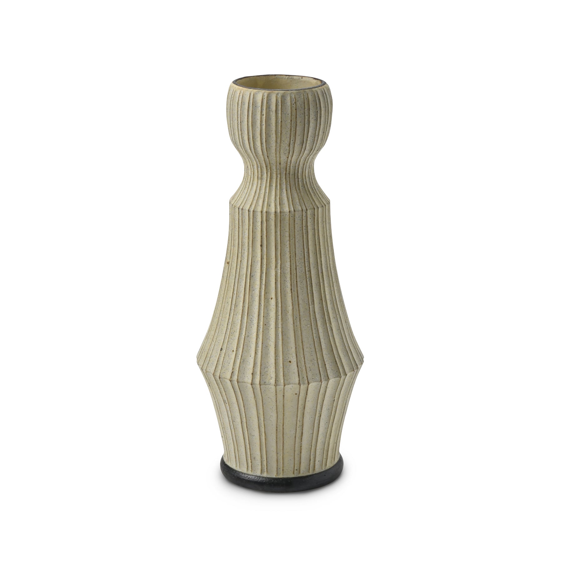 Akio Nukaga's work explores the possibilities of how he leaves a trace of himself in clay. This piece features his signature “Pleated Work” technique of carving grooves into the wet clay after it is thrown on the wheel. The form—inspired by traditional kokeshi dolls—is accentuated by these grooves curving down the profile of the vessel creating movement and rhythm. After the first firing and before the second. he finishes the vessel by applying different colored slips (liquid clay)—a technique that he has refined over the last 30 years. This piece will go on sale as part of Group 3 on Thursday July 28. 2022. at 4pm PDT.