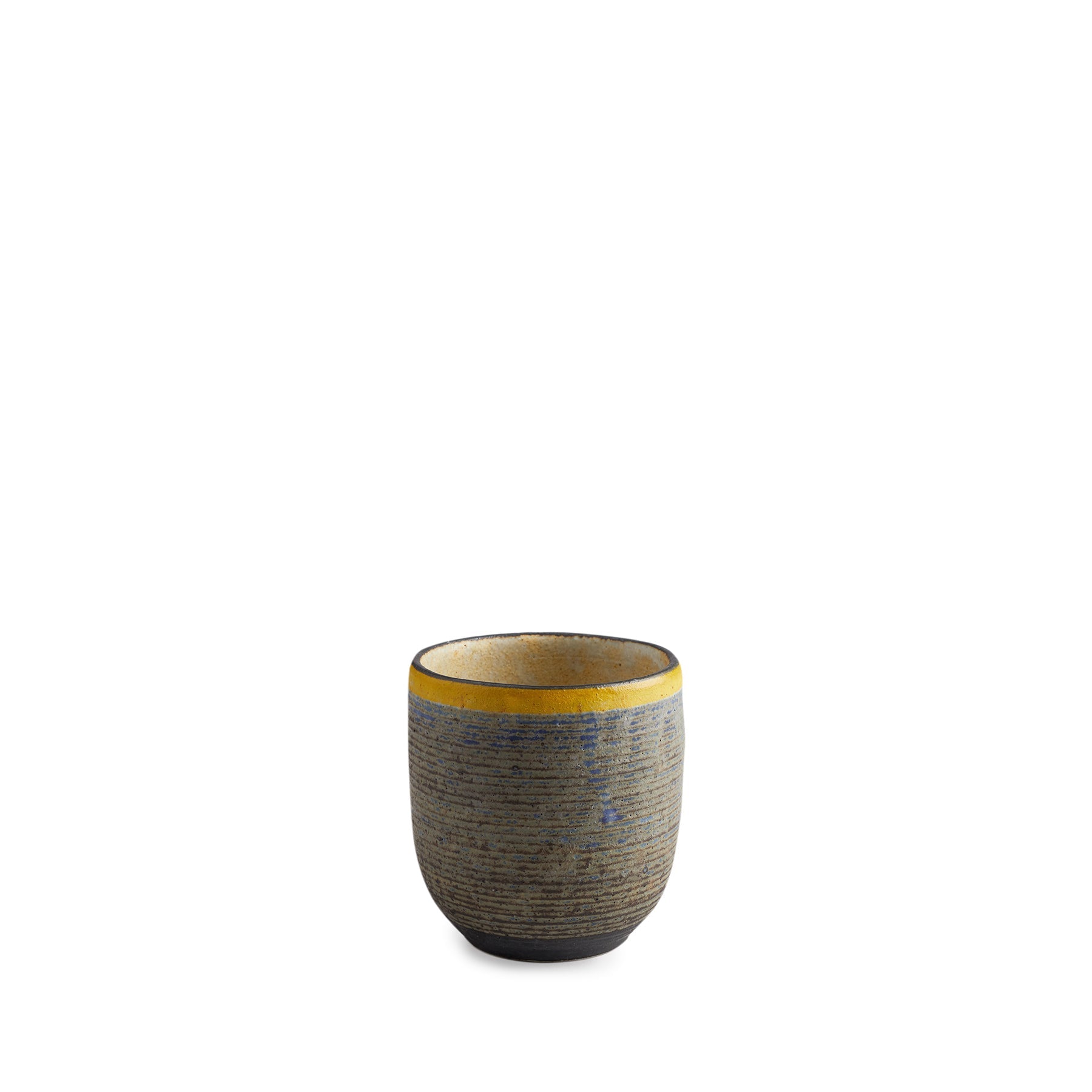 This practical tumbler still features the hallmarks of Akio's expert craftsmanship. The rim is ringed with bright yellow slip. The sides of the tumbler are carved with parallel lines that accentuate the shape of the cup. The shinogi—a traditional Japanese decorative technique—are carved carefully by hand into the surface of the piece. After bisque firing Akio applies colored slips and then glazes the pieces with translucent matte glaze. Beautiful to see and incredible to hold.