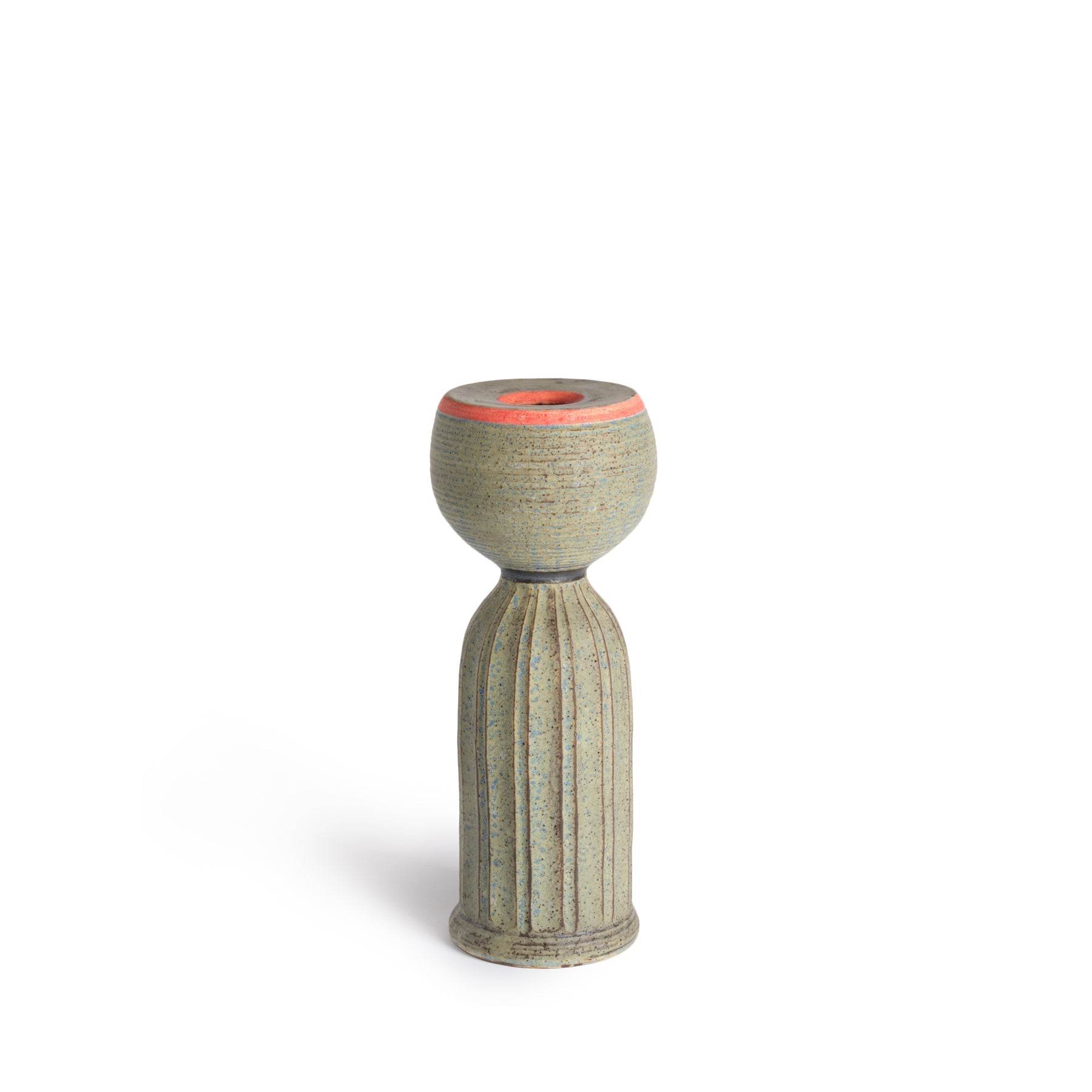 For Akio Nukaga throwing on the wheel is a technique close to his heart. one that he can always rely on. Each piece in this collection is an exploration in stacking architectural forms including spheres. cylinders. and cones in hopes of pushing expectations of what tableware can be. This piece features his signature “Pleated Work” technique of carving grooves into the wet clay after it is thrown on the wheel. The form—inspired by traditional kokeshi dolls—is accentuated by these grooves curving down the profile of the vessel creating movement and rhythm. Akio's use of bright red slip in this piece is a special nod and celebration of his 60th birthday this year.