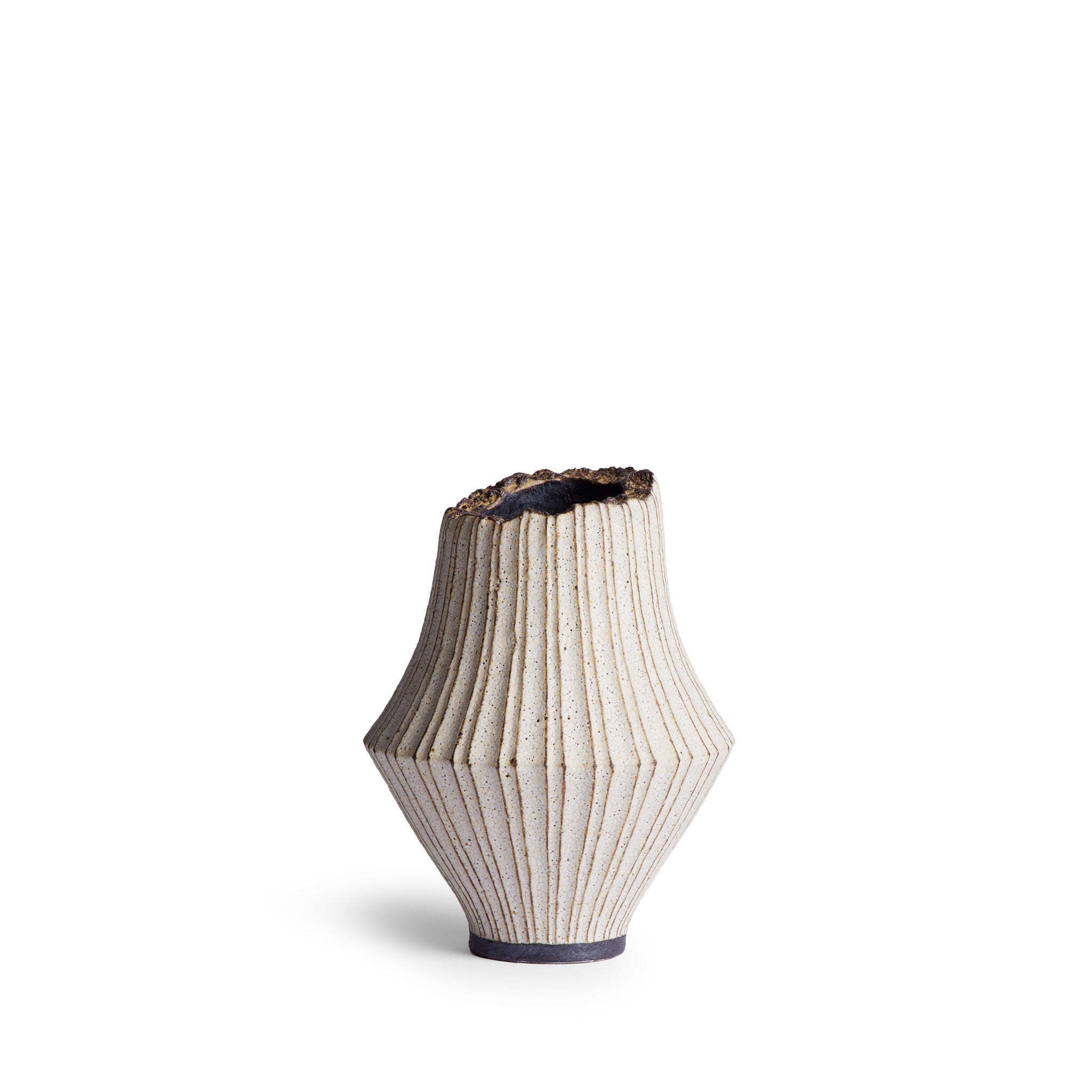 This year Akio set out to create new expressions through the beauty of imperfection. Drawing inspiration from Kakuzo Okakura. Akio says. "Okakura notes that imperfect objects invite us to use our imaginations—to 'complete' them in our mind's eye. His ideas inspired me to think beyond symmetry and explore imbalance. which gave way to Imperfect Vessels. I hope you'll enjoy it and let your imagination run wild!" This piece features his signature Pleated Work technique of carving grooves into the wet clay after it is thrown on the wheel. These grooves accentuate the profile of the vessel creating movement and rhythm. Akio finishes the vessel by applying different colored slips (liquid clay)—a technique he has refined over the last 30 years—to create richly varied surfaces that are a joy to see and touch.