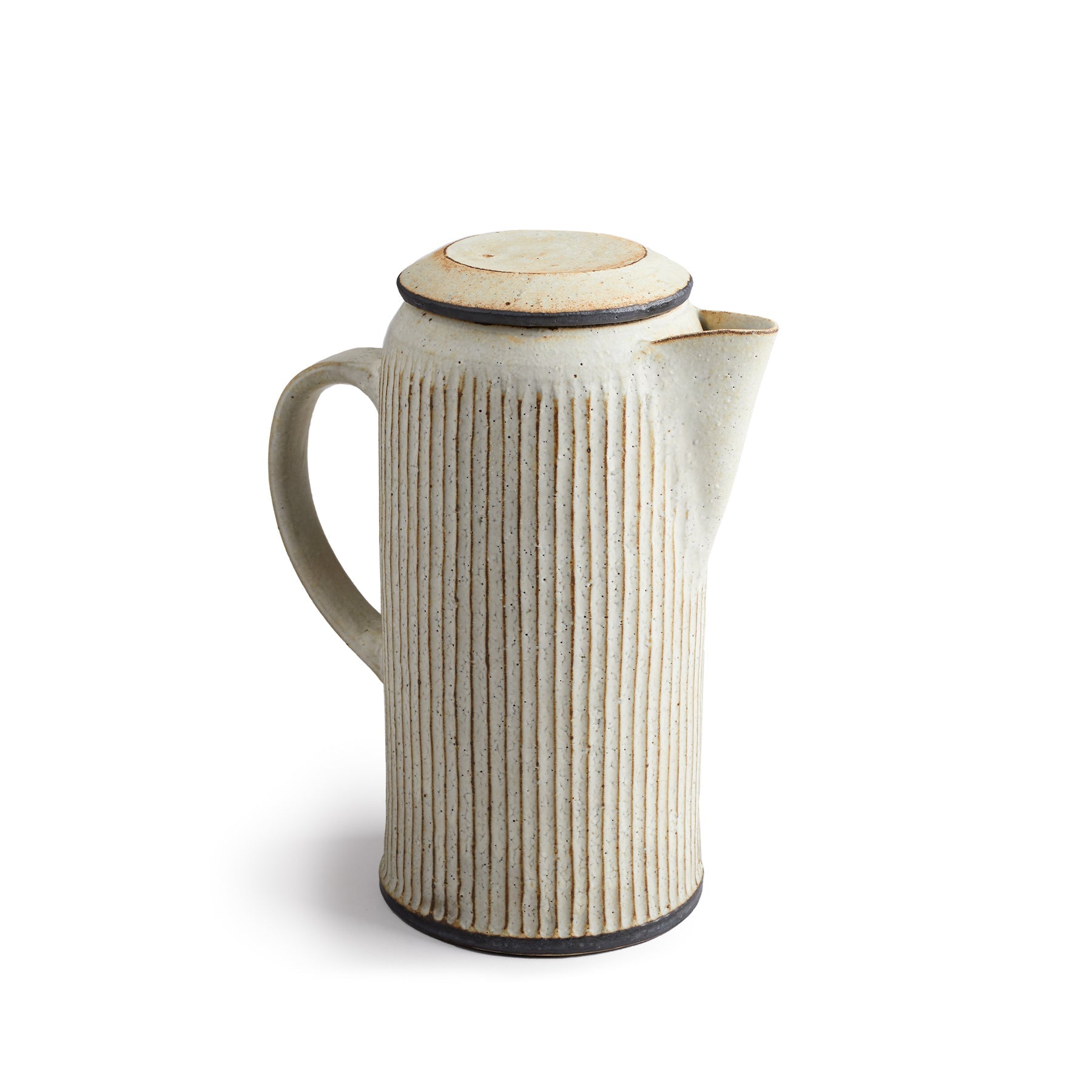 This large and stately teapot features vertical lines carved down the body of the teapot and is decorated in Akio's signature white slip. The shinogi—a traditional Japanese decorative technique—are carved carefully by hand into the surface of the piece. After bisque firing Akio applies colored slips and then glazes the pieces with translucent matte glaze. Beautiful to see and incredible to hold.