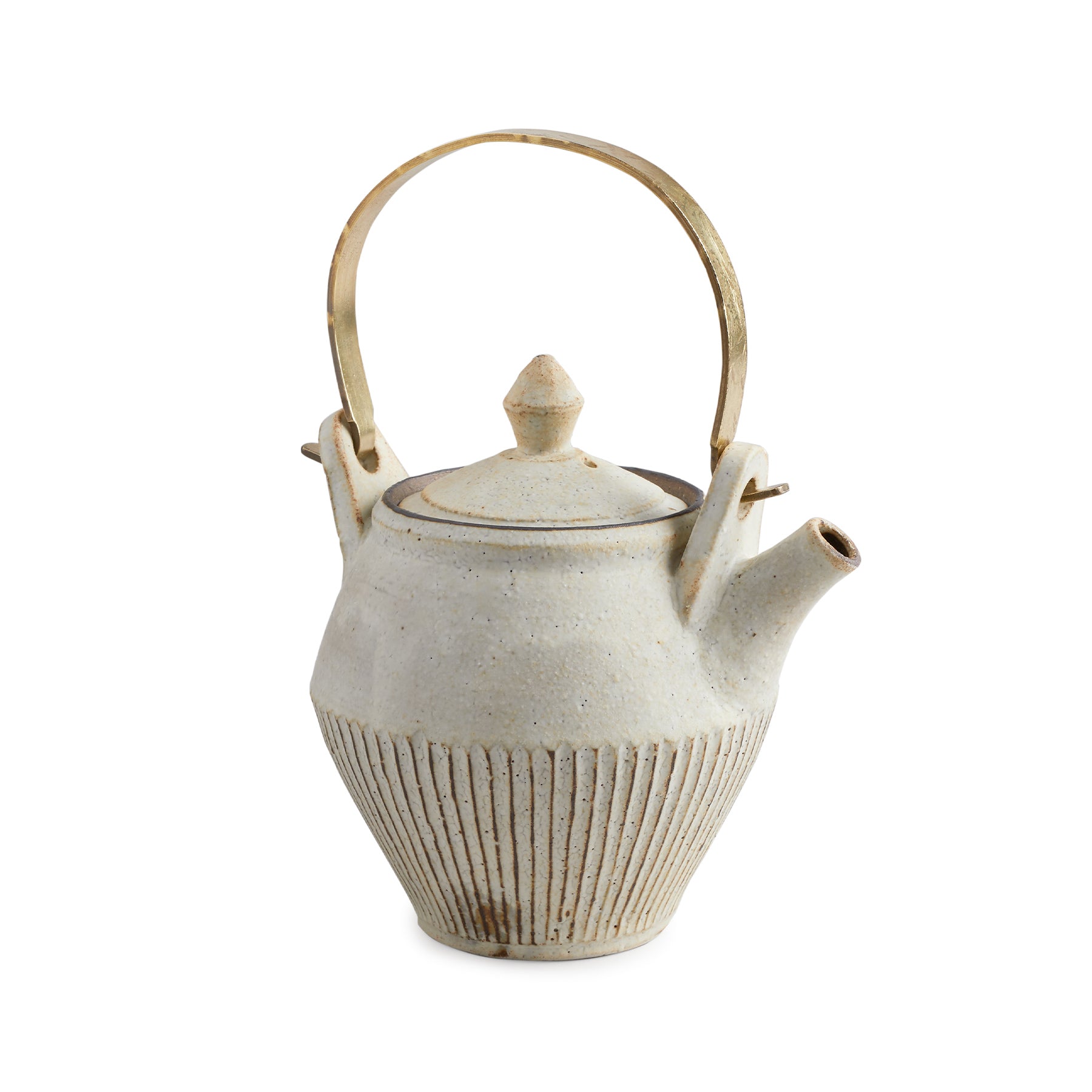 This lovely teapot features a base carved with vertical grooves and a whimsical spout. The brass handle makes this piece a rare example of an Akio piece with mixed materials. The shinogi—a traditional Japanese decorative technique—are carved carefully by hand into the surface of the piece. After bisque firing Akio applies colored slips and then glazes the pieces with translucent matte glaze. Beautiful to see and incredible to hold.