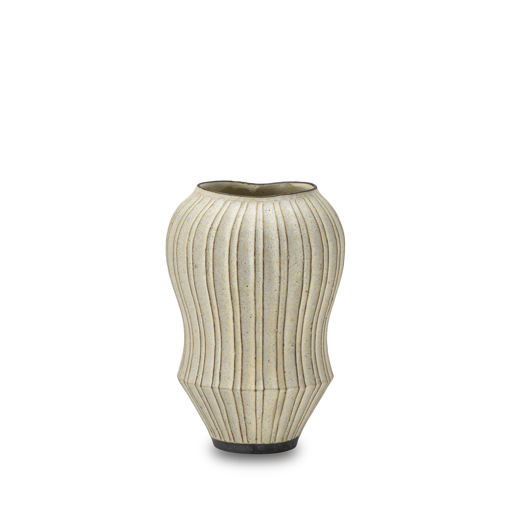 Akio Nukaga's work explores the possibilities of how he leaves a trace of himself in clay. This piece features his signature “Pleated Work” technique of carving grooves into the wet clay after it is thrown on the wheel. The form—inspired by ancient earthenware—is accentuated by these grooves curving down the profile of the vessel creating movement and rhythm. After the first firing and before the second. he finishes the vessel by applying different colored slips (liquid clay)—a technique that he has refined over the last 30 years. This piece will go on sale as part of Group 2 on Wednesday July 27. 2022. at 12pm PDT.