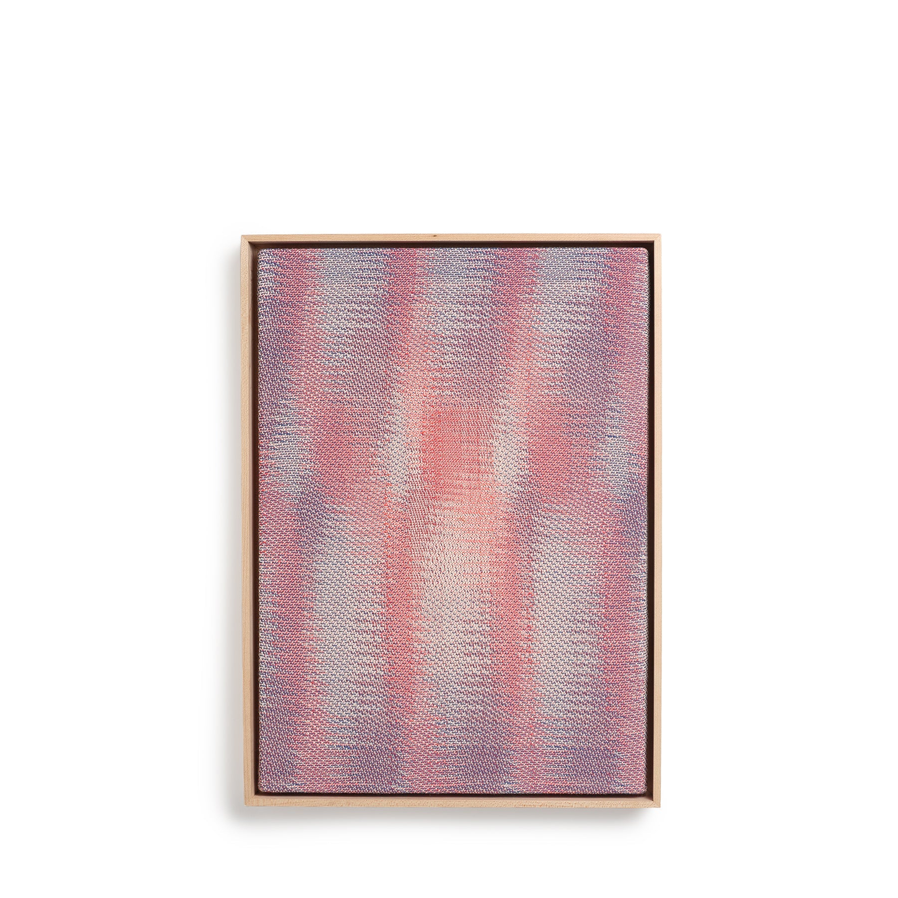 Sarah Wertzberger is an artist and designer whose work emerges through investigations in woven structures. color relationships. and material experimentation. This handwoven piece blends cotton and polyester into a pattern referencing early 2000s home weavers who experimented with computer-aided looms to create curves and blurs—visual effects that are rare in handloom weaving. The visual language is also informed by iridescent polar stratospheric clouds. giving the work a shifting. luminous quality as the light changes.
