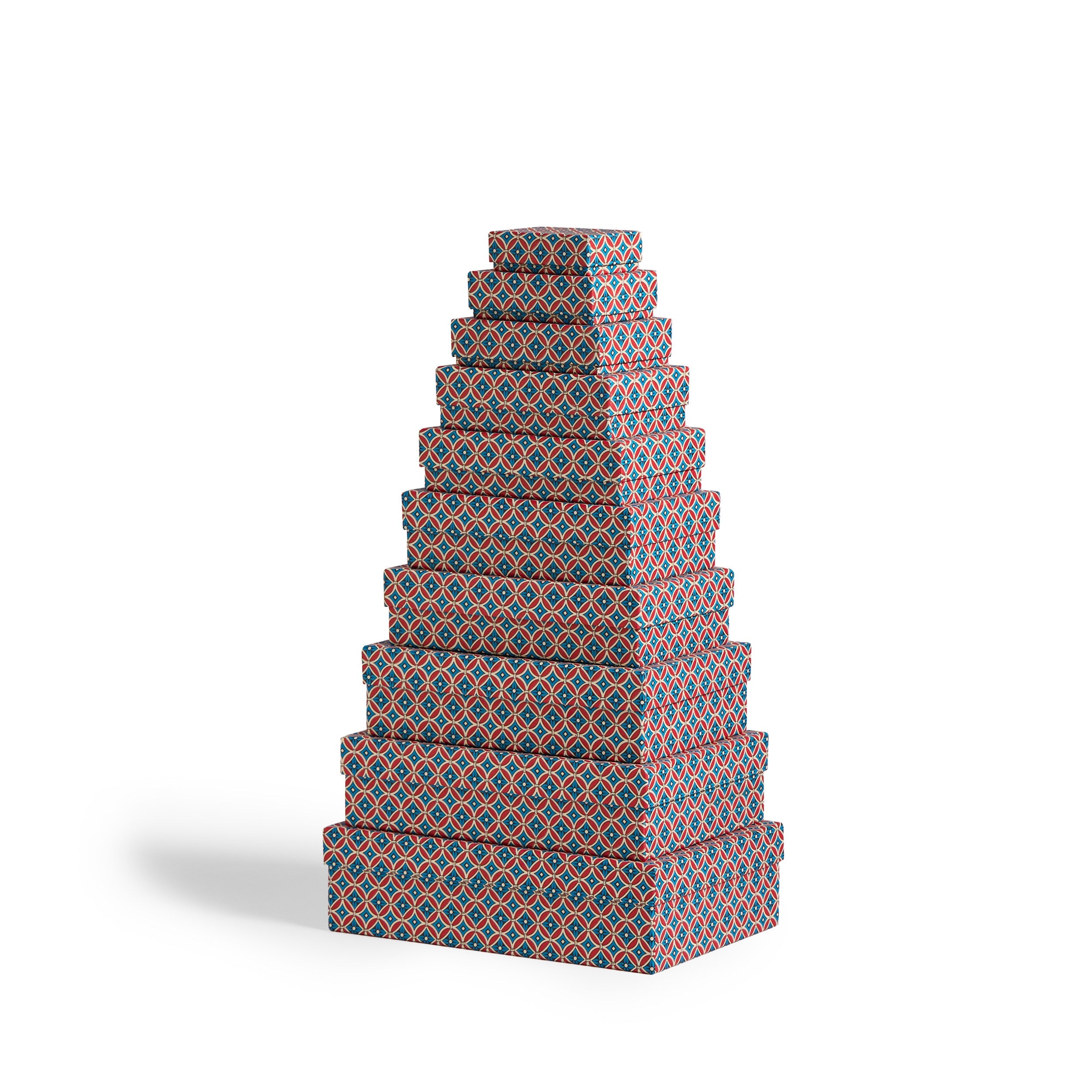 These nesting box sets are covered in Japanese washi paper that has been silkscreened with bright. graphic patterns. They can be used for various purposes. including elegant storage. decorative accents. or unique gift packaging. Available for a limited time.