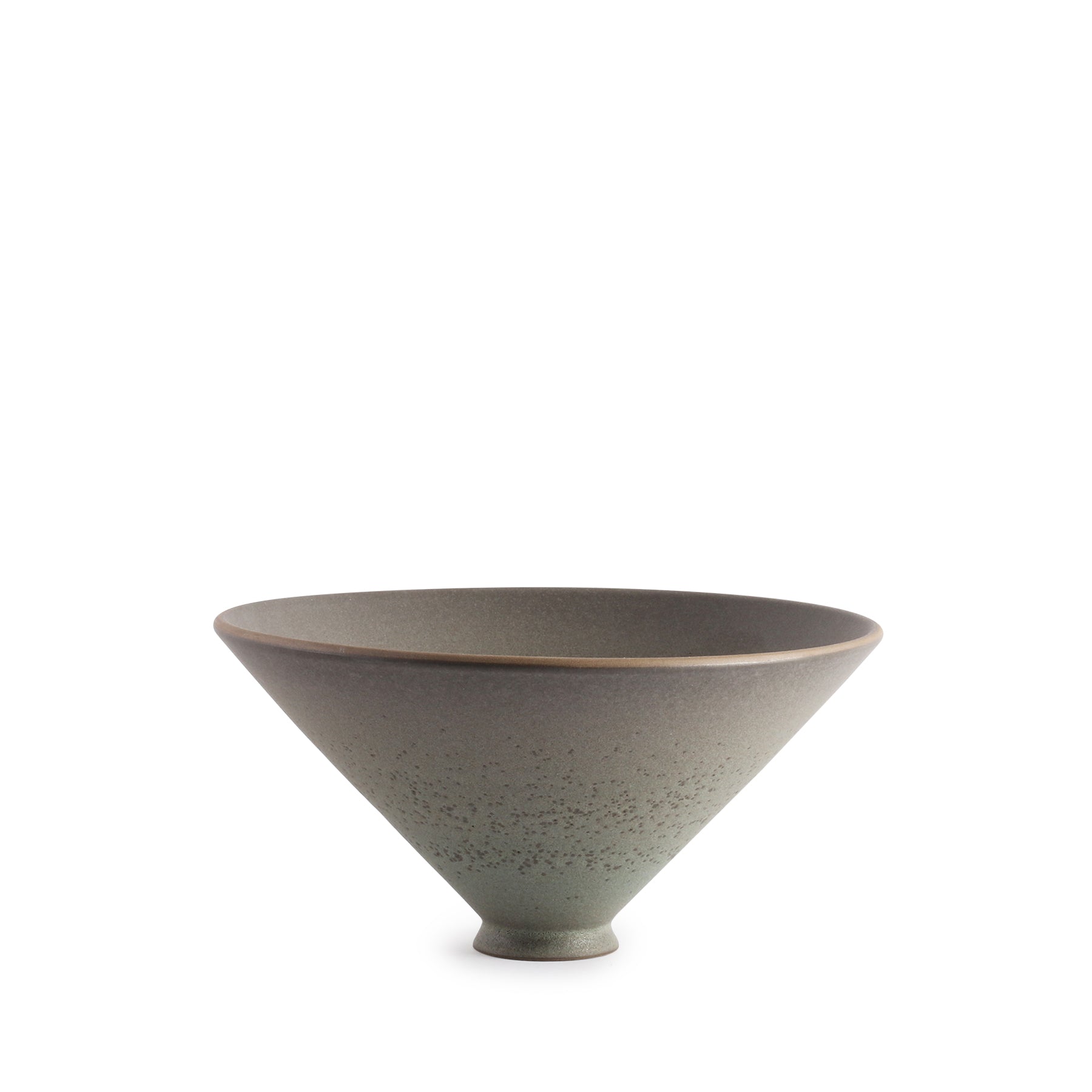 The form of this bowl is created by the intersection of two cones pointed at each other. On the inside you can see the point of the smaller cone in the bottom. The surface is glazed with Cast Iron Grey over KPFA. The interaction of the glazes in the kiln produce a subtle stipled texture.