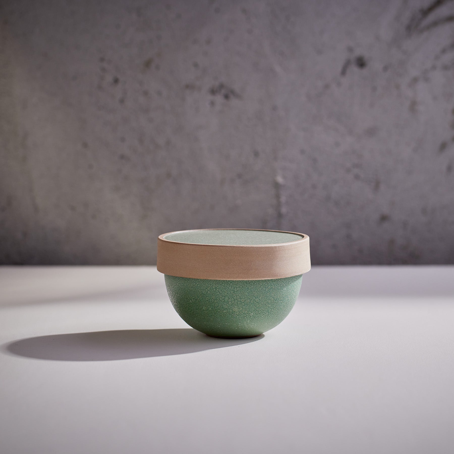 Edith Heath designed the Coupe and Rim line. Each are distinctively different from each other. This lidded bowl is a combination of the two designs. The rim of the lid is added on to a simple Coupe design. The lid also doubles as a shallow bowl. —Tung Chiang. Clay Studio Director