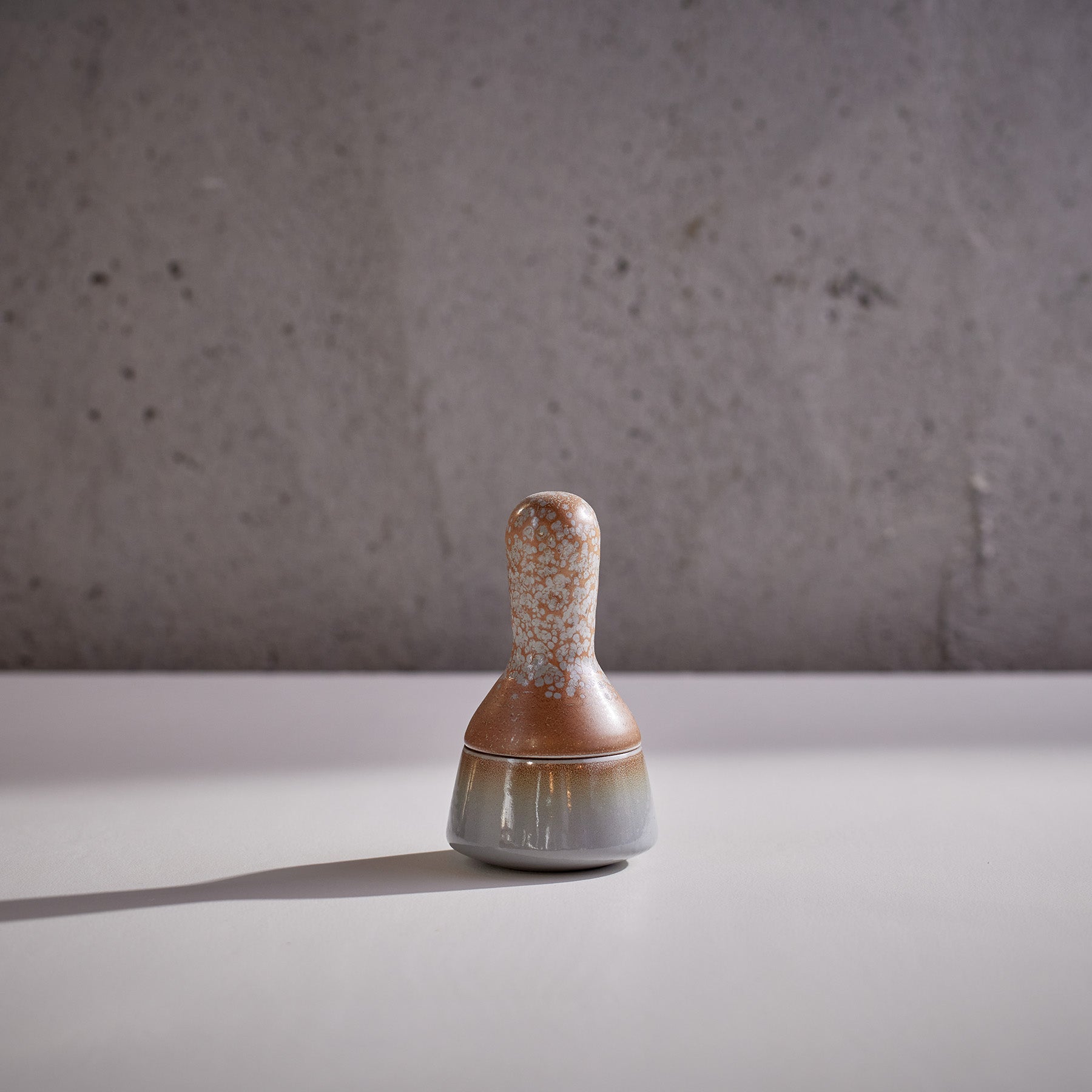 This piece is inspired by the wooden mallet my friend uses on their wood work. It has an elongated handle which becomes the prefect lid for a small container. —Tung Chiang. Clay Studio Director