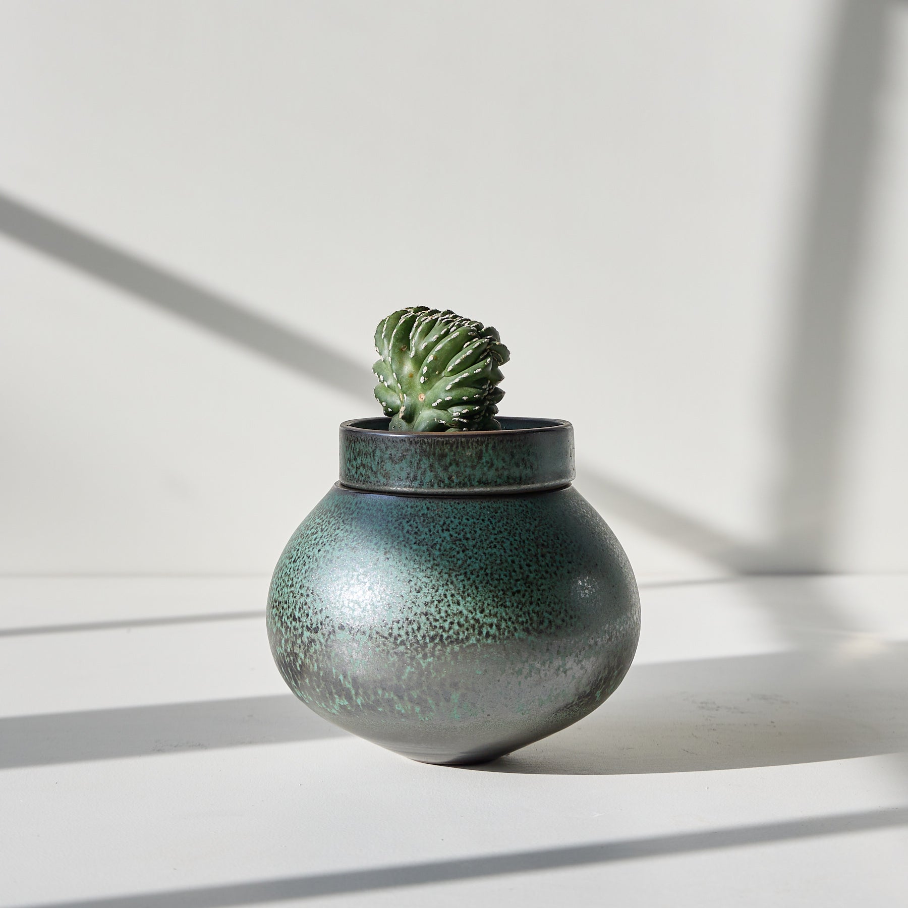 Inside the round-bodied exterior vase. the plant pot within is a slightly tapered cylinder with a wide rim. I wanted to give the roots of the plant equal room from top to bottom so they wouldn't be trapped in a tight space as they grow. The inner pot drains into the exterior vessel. which can also be used as a vase. — Tung Chiang