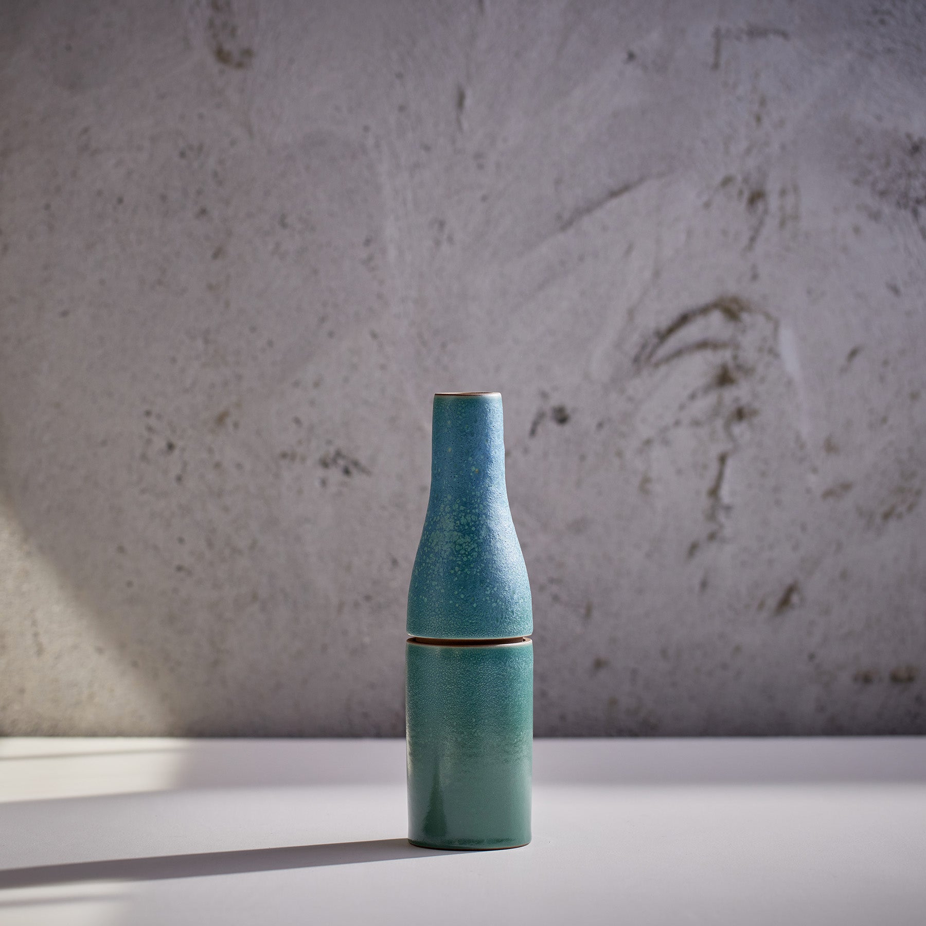 This looks like a single bottle at first but the parting line reveals the separation between top and bottom. Once separated it becomes two vases or store your favorite object in the bottom piece. —Tung Chiang. Clay Studio Director