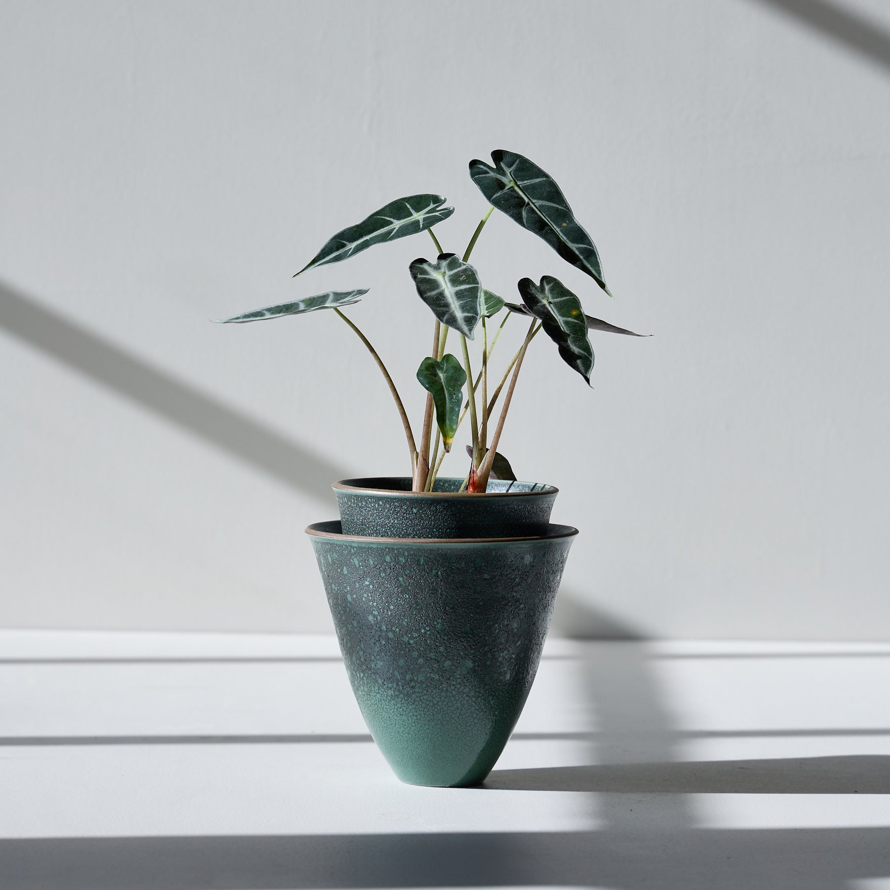 This design celebrates plants without a flowering element. by taking the form of a blossom itself. The two nesting vessels look. in profile. like a trumpet flower. with the inner stamen emerging beyond the edge of the outer petals. The plant itself further extends the silhouette. Its leaves many directions give a fullness but also an organic randomness to the overall expression of plant and planter together. — Tung Chiang