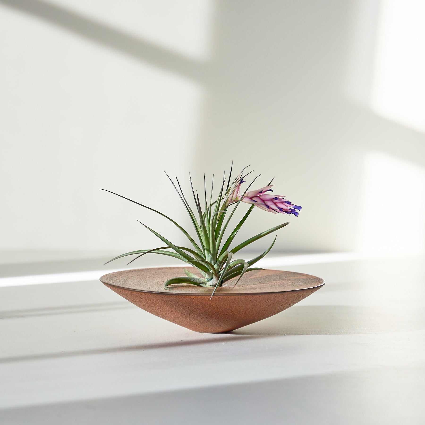 Air plants can live almost anywhere. but I've always thought they deserve a dedicated space to show off their unique personality. This shallow bowl is hollow inside. with two holes that enable the plant to be secured and held upright by a wire. The red terra cotta glaze has a tactile texture added with darker glaze dots that speak to the color of the plant. — Tung Chiang