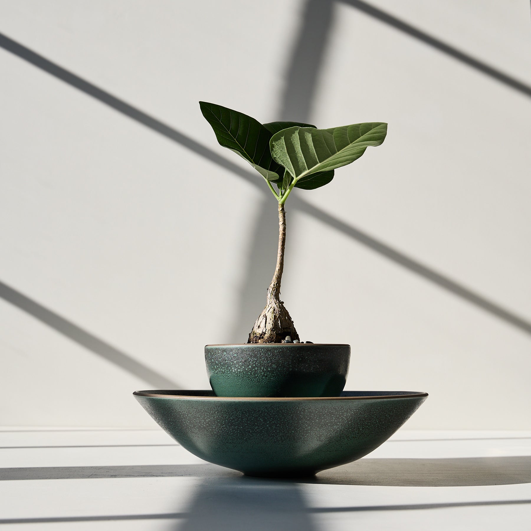 This form plays with the shapes of Heath's classic bowl shapes. yet it contains a surprise. The large saucer resembles a shallow serving bowl in profile but gains lift from a foot beneath it. Inside. the clay rises to form a secondary container that holds the smaller planter bowl. and keeps water from pooling on the larger surface. — Tung Chiang