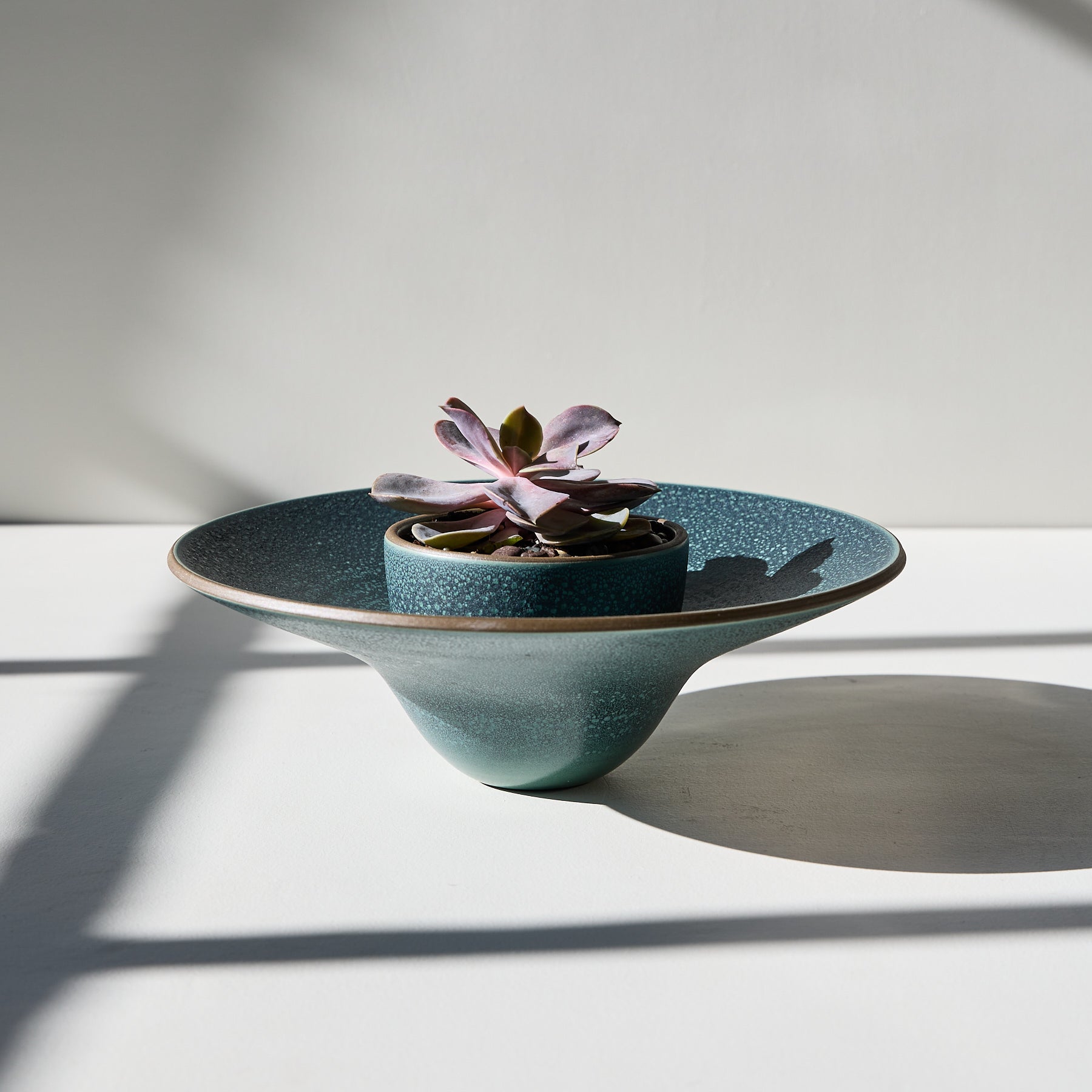 This form is inspired by Ikebana. the Japanese art of flower arranging. which is not just about the vase or just about the flower. but about the space between them as well. Here. a small. round bowl rests within a large. footed bowl. The large. sloping interior offers a vast surface that contrasts the color of the plant. In this case. the plant and its vessel are reversed from the typical colors. with rosy leaves against a green-blue glaze. and a smooth wiped rim that allows Heath clay to peek through. — Tung Chiang