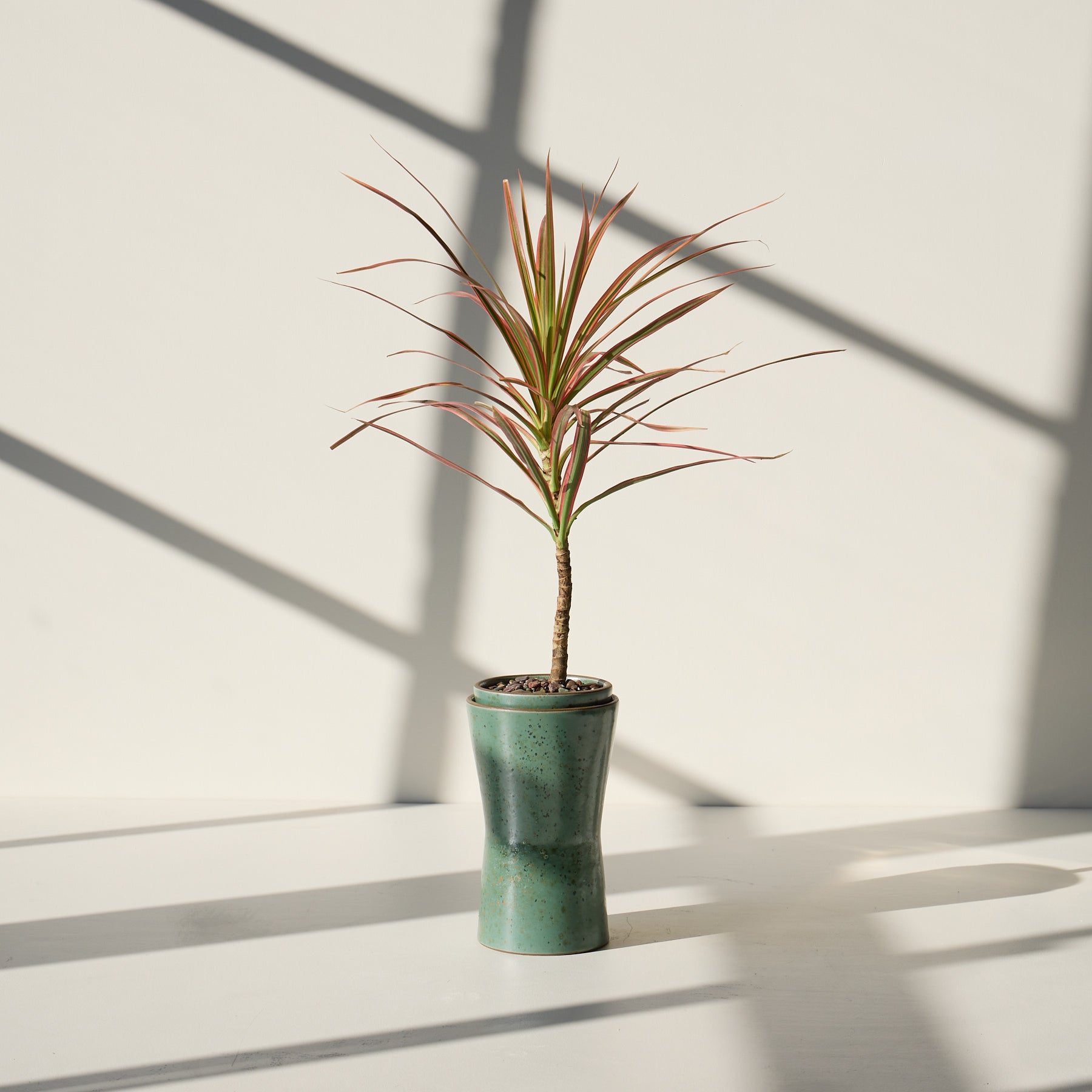 I wanted to design a vessel that could float naturally above its saucer. leaving space for the water to collect below. The saucer is shaped like a bowtie. with a taper at the midpoint that holds the inner pot in place. The saucer can also be a vase. — Tung Chiang