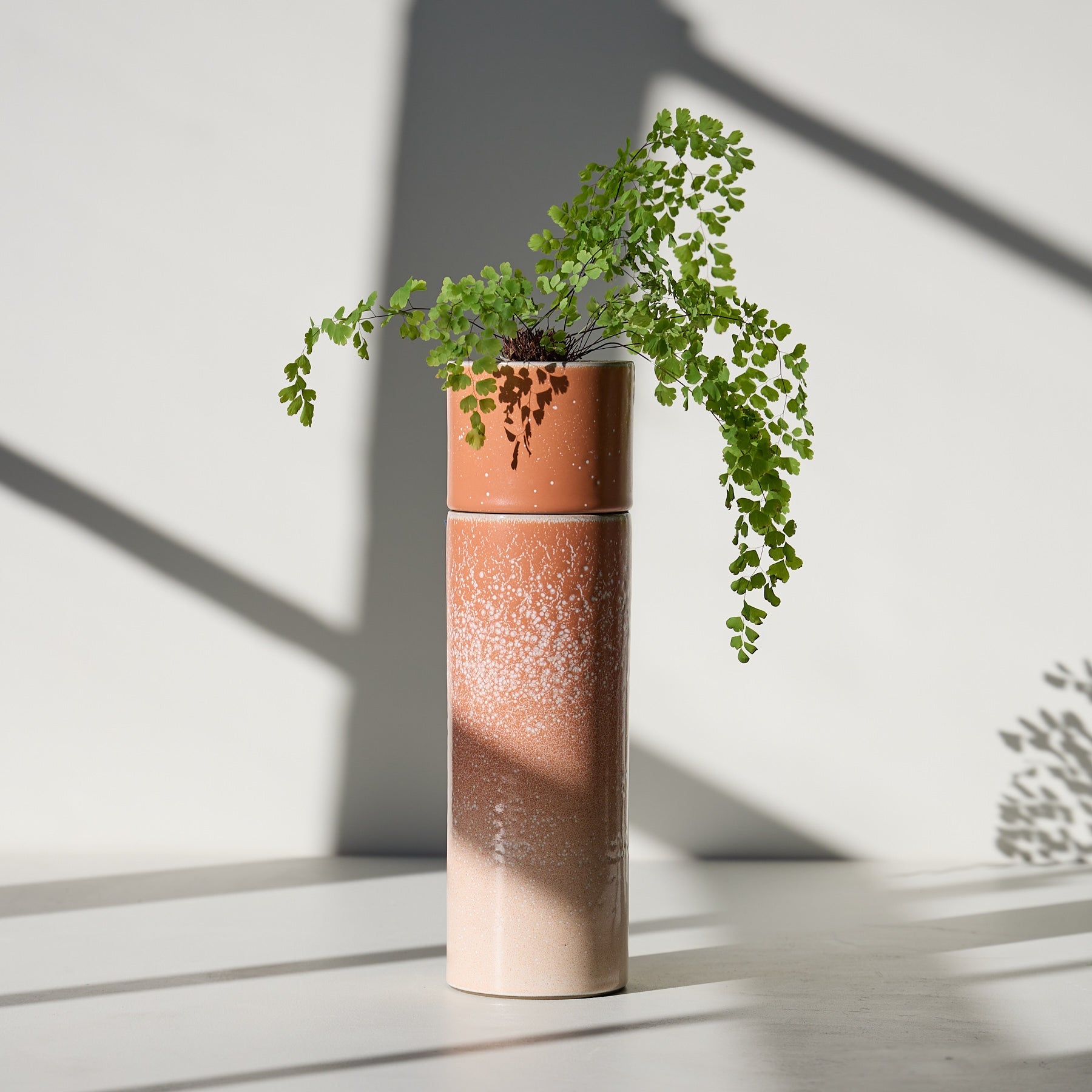 In the forest. I love to notice the plants that aren't just growing from the forest floor. but from above. Ferns and trees hang over the creek. Here. a very tall saucer raises the planter and the plant high and casts long shadows. When the planter is watered. it drips down into the long cylinder. which can be used as a tall vase. — Tung Chiang