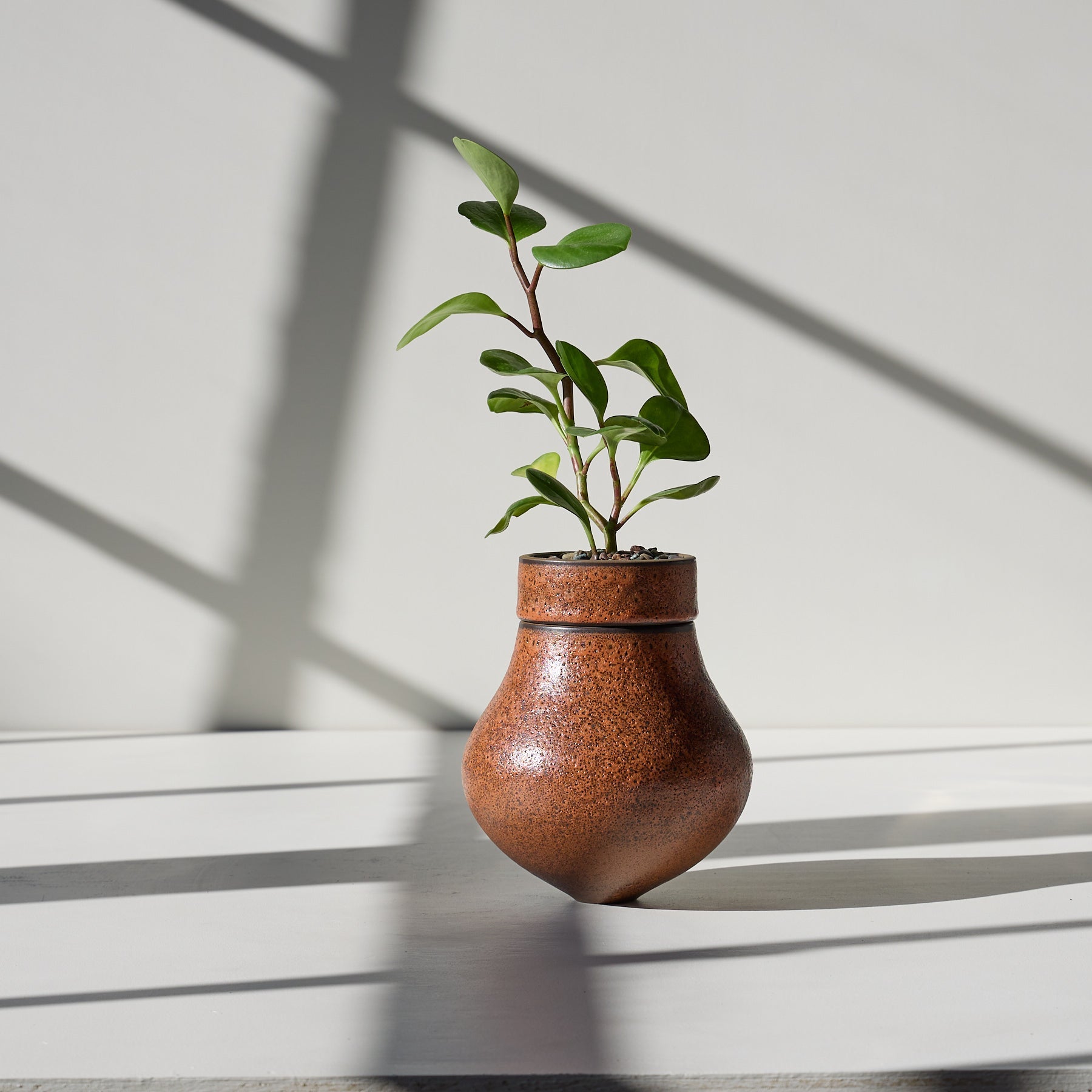 Inside the round-bodied exterior vase. the plant pot within is slightly tapered. with a wide rim. I wanted to give the roots of the plant equal room from top to bottom so they wouldn't be trapped in a tight space as they grow. The inner pot drains into the exterior vessel. which can also be used as a vase. The small foot at the base of the saucer gives the form a sense of lift and a profile reminiscent of a water drop. — Tung Chiang