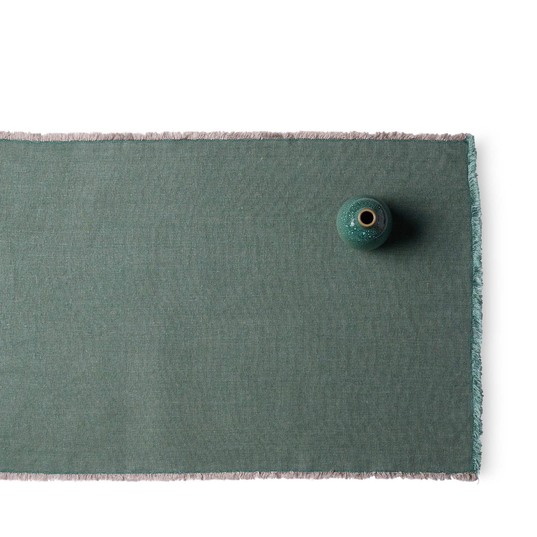 Each runner is made from beautiful. yarn-dyed linen with a luxurious hand. The fabric is woven on vintage shuttle looms by a duo of craftswomen in Italy. The warp and weft threads are dyed slightly different colors resulting in a visually textured quality to the fabric and different colored fringe on opposite edges.