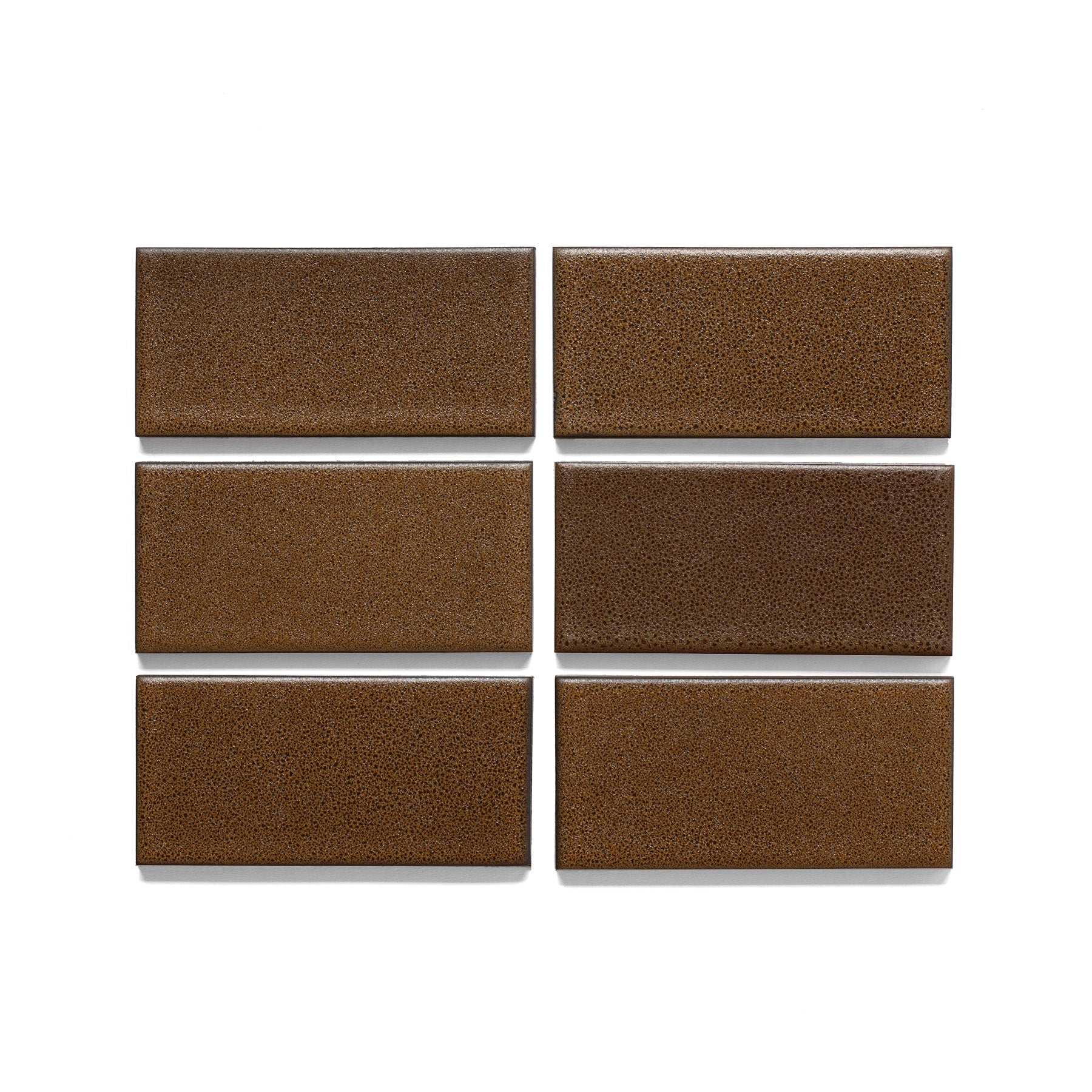 A warm brown with pronounced tonal variation. Sold individually. Up to 6 tile samples may be ordered online. Glaze sample out of stock? Don't worry—all of our tile is made to order for every project.